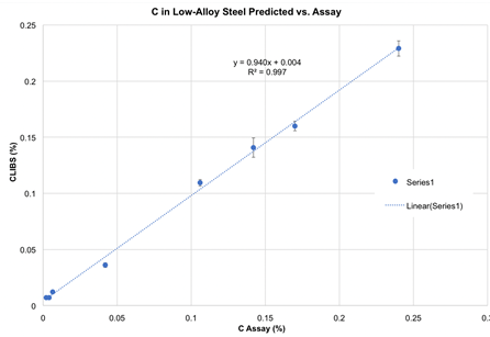 Точность на Рис.2 показана для глобальной калибровки, охватывающей углеродистые и хромисто-молибденовые стали. Глобальная калибровка по Углероду подтвердила возможность разделения низколегированных и высоколегированных углеродистых сталей. Для сталей с содержанием Углерода, близких к пороговому значению 0,03%, операторы могут выбрать опцию Типовой калибровки (ТК). Например, если материал должен содержать 0,033% Углерода, то оператор может сделать калибровку по образцам с аналогичным содержанием Углерода. ТК исключает смещение калибровочной кривой, и, любые отклонения результатов или погрешности связаны только с повторяемостью (воспроизводимостью). Если важно проанализировать Углерод с более высокой точностью, мы рекомендуем добавить ТК для представительного сертифицированного стандарта и затем использовать эту калибровку. Этот подход распространен для искровых ОЭС и также хорошо работает для LIBS.